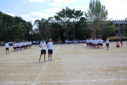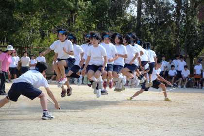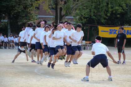 《体育祭−13》1年団体競技 大縄跳び 公開日 2013/10/01 更新日 2013/10/01 学校の様子 いよいよ学年団体競技の始まりです。最初は1年生の「大縄跳び」競技です。なかなかうまくいかない大縄跳びですが、学年練習や体育の時間などで練習を重ね、何とか飛べるようになりました。本番は緊張感漂う中での競技でしたが、先攻の2組(ピンクチーム)が20回以上跳躍を記録し、見事に勝利を獲得しました。負けた1組も良く頑張ってくれました。差はほんのわずかでした・・・。両クラスの団結が光りました。