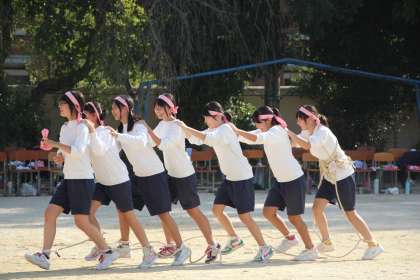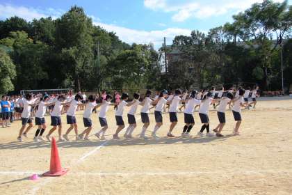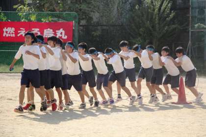 いよいよ今年の体育祭もクライマックスを迎えます。全校生徒によるむかで競争リレーです。各クラスが男女に分かれて”むかで”を作り、1年女⇒1年男⇒2年女⇒2年男⇒3年女⇒3年男の順にリレーをしていきます。どのチームも練習の成果で、素晴らしいスピードで歩調を合わせます。ピンクチームがリードのまま終盤を迎えましたが、青チームが追撃し、あと少しの所まで追い込みましたが、わずかに届かず、ピンクチームが勝利を得ました。大変盛り上がった、感動と涙の全員競技でした。