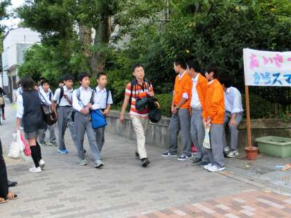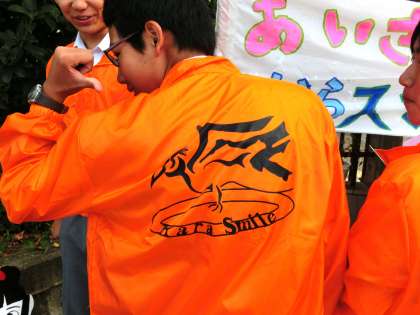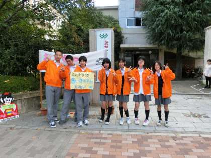 今日から10月のあいさつ運動が始まりました。そしてついに、”からすまいるブルゾン”のお目見えです。5月からシンボルマークを公募し、あいさつ運動や生徒会の校外活動に着用するブルゾンをデザインし、先日の文化祭の時に全校生徒に披露した”力作”です。10月のあいさつ運動が、現在の生徒会執行部が中心となる最後の取り組みです。まだ少し蒸し暑い朝でしたが、早朝から揃いのオレンジ色のブルゾンを着用して、いつもより元気に「おはようございま〜す!」と挨拶をしてくれていました。登校した生徒はもちろん、校門を通りかかった方も、いつもとは違う華やかな様子に、いつも以上の挨拶を返していただきました。
