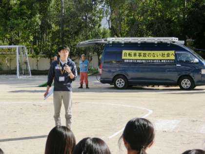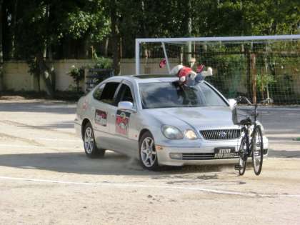 今日来ていただいたプロのスタントチームは、「スーパードライバーズ」の6名の皆さんです。いろいろな映画やテレビドラマにも出演されている”本物”のプロです。様々な場面での自転車の危険な乗り方、交通ルール違反による事故の場面を再現していただきました。車と自転車、自転車道し、歩行者と自転車、歩行者と車など、どの場面も普段どこにでも起こる可能性があるものばかりでした。車と衝突して、車のボンネットを飛び越して地面に落下した場年など、本当に怪我されたのでは・・・と心配になるほどでした。