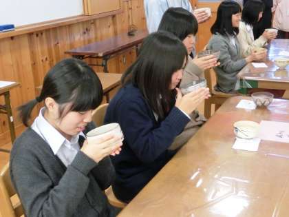 今日は、NPO法人京都文化企画室より2名の先生に講師として指導していただきました。お菓子の頂き方、お茶の点て方、渡し方、戴き方について、きめ細かくお話をしていただき、1ステップずつ練習を行いました。お茶の体験は、文化祭でのPTAのお茶会に続いてで、慣れている人もいましたが、やっぱり「にがい・・・!」とまゆをひそめる人も・・・。でも丁寧なご指導のおかげで、上手に点てられた人が多く、お褒めの言葉をいただきました。