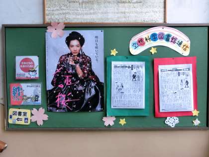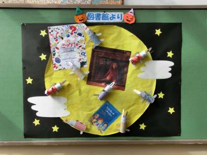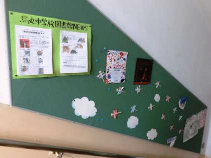 北校舎の掲示より・・・図書室へ来てね! 公開日 2013/10/18 更新日 2013/10/18 学校の様子 北校舎の廊下や階段には色々なポスターや作品が掲示されています。そのいくつかを紹介したいと思います。 まずは図書室関係です。新しく入った本や、様々な話題の紹介など、すぐにでも図書室へ行ってみたくなる掲示物が色々な場所に貼ってあります。素敵な掲示ですね。