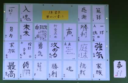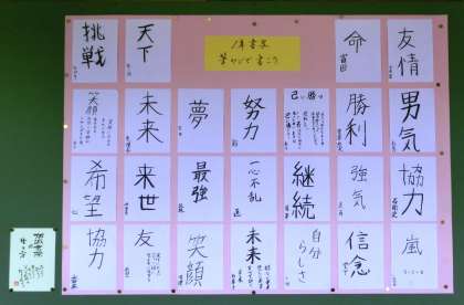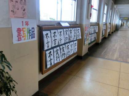 北校舎の掲示より・・・1年生の書写作品 公開日 2013/10/18 更新日 2013/10/18 学校の様子 3階の廊下には、国語の書写作品が掲示されています。「不言」と「実行」、そうありたいですね。また、筆ペンによる作品の掲示もあります。努力、夢、未来、友、勇気、継続、最高、家族、挑戦、勝利・・・思い思いの個性あふれる作品がほのぼのとしています。西岡先生の一言に目を奪われますが・・・
