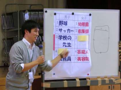 岩本先生からは、「中学生のなりたい職業」を題材に話をしていただきました。”岩本調べ”によると、男女別のベスト5は次のようになります。