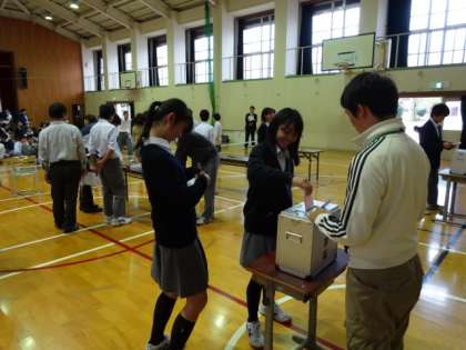 投票は、上京の選挙管理委員会にお願いし、本物の投票箱をお借りして行われました。何やら投票も気が引き締まる思いでした。