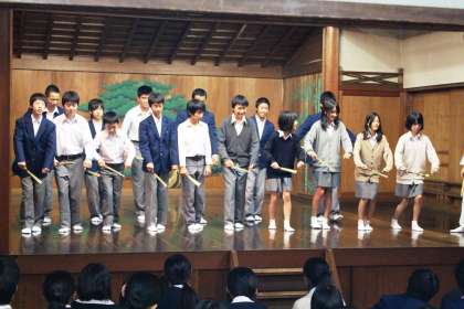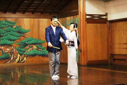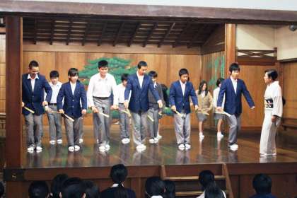 その後、代表者の生徒が、般若の面をつけ、舞台の上で動く体験をしました。面をつけていると視野が狭められ、前しか見えず、恐怖感もあります。舞台で演じるというのは、よほどの練習をしなければできないということを本当に実感できる体験でした。