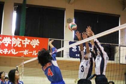 そして迎えた第3セット。立ち上がりは伏見中の攻撃が冴え、9−14とリードを許してコートチェンジです。ところが、コートが変わってからは烏丸中に流れが向きます。第1セットと同様にサーブが決まり、みるみるリードを縮め、ついに逆転!そしてそのままのペースを保ち、25−18で第3セットを奪い、見事1回戦を突破しました。