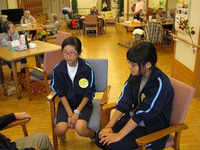 2年生チャレンジ体験その4 公開日 2013/11/08 更新日 2013/11/08 学校の様子 特別養護老人ホームの体験では、車いすの高級車に乗せて頂きました。車いすでお年寄りを乗せたり、おろしたりする時の配慮を細かく教えてもらいました。 また別のサービスセンターでは、行ったらすでに2人がお年寄りの話し相手になっていました。2人とも93歳の方から地域のことを聞いて、お世話と言うより社会科の勉強をしている感じでした。しっかり勉強してきてね、と励まされていました。