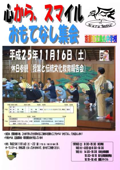 いよいよ11月16日(土)の「オープンスクール・休日参観・心からすまいるおもてなし集会」が迫ってきました。いま学校では、当日へ向けての準備が進んでいます。当日は、保護者・地域・関係者の皆様に1日烏丸中学校を公開し、生徒たちの学習の様子をご覧いただき、「心からすまいる〜おもてなし集会」へも参加していただきます。休日で何かとご多用の折ではございますが、是非烏丸中学校へご来校いただき、生徒たちの心ばかりの”おもてなしの姿”を見ていただければと思います。宜しくお願いいたします。