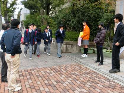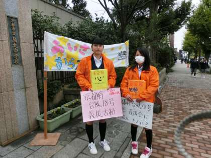 今日の休日参観と22日までのオープンスクールに合わせ、11月の「あいさつからすまいる運動」がスタートしました。今回は新生徒会執行部として最初のあいさつ運動です。また同時に、台風18号の災害義援活動もスタートしました。