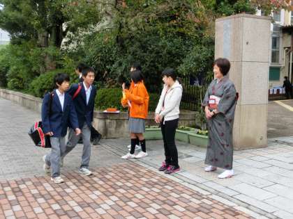 土曜日ということもあり、校門を通過する方が少なく、ややさみしい状況でしたが、今日の登板の生徒たちは、登校する生徒や先生たちと元気に挨拶を交わしていました。生徒会はからすまいるブルゾンで、佐々井先生は和服姿で挨拶をしていただいていました。週明けの火曜日からはもっと盛り上がると思います。もっともっと元気に挨拶が行き交う学校にしていきたいですね。「おはようございます!」