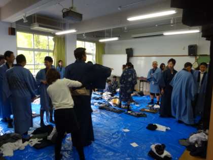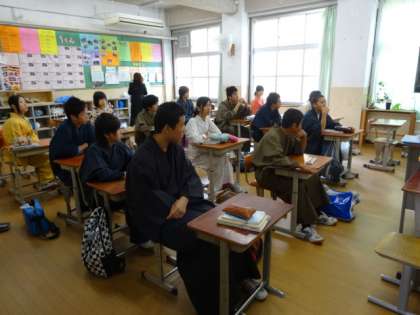 2時間目は着物を着たままの姿で、英語と数学の授業を受けました。みんなは1年時にも着付け体験を行っていますが、着てすぐ脱ぐというものでした。今回は体も成長し、着るだけでなくそのまま生活し、おもてなしにも着るという事で、気合いが入りました。特に女子は随分と着物がしっくりと馴染んでいるような感じがし、なにかしら女子から女性へ変化していくような感覚になりました。