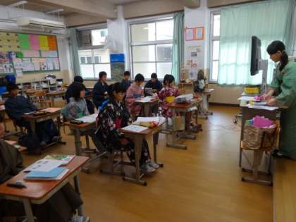 3年生では、3,4時間目に行われる「心からスマイルおもてなし集会」に向けて、一日を和服で過ごそうと、まずは1時間目に着物の着付けを行いました。