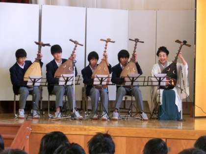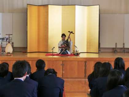 今日22日(金)の2時間目、2年生の国語の授業として、体育館で筑前琵琶による「平家物語」の弾き語りを鑑賞・体験しました。