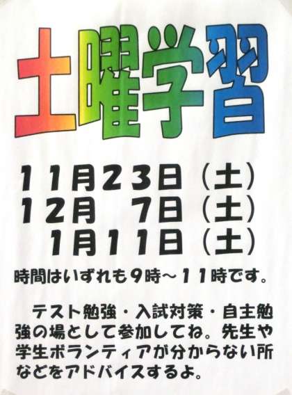 これからもほぼ月1回のペースで土曜学習を実施していく予定です。受験が目前に迫った3年生はもちろん、1・2年生の人もこの機会を十分に活用して、自分の学力補充やスキルアップにつなげてくれればと思います。次回は冬休み明けの1月11日(土)を予定しています。