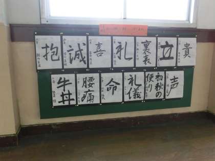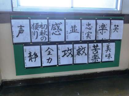 習字の展示・・・2年生は”生きチャレを漢字で表すと・・・!”