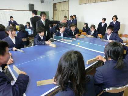 1年生は、今週の月曜日に訪問した障がい者スポーツセンターで行われていた「卓球バレー」を体験しました。この「卓球バレー」を通して、誰もが出来る身近なスポーツと障がいを関連させ、「バリアフリー」の取り組みが、障がい者の方の自立支援に役立っていることを深く理解できればと思います。視聴覚室に2台の卓球台を設置し、各クラス4チームの総当たり戦を行いました。卓球バレーはバレーボールと同じルールで、3階で相手のコートにピン球を返します。強すぎたらピン球が弾んでコートから飛び出してしまい、チームワークが必要です。生徒たちは最初は怖々・・・といった感じで競技をしていましたが、だんだんとコツを覚えて、ラリーが続き、ノリノリで競技に没頭していました。視聴覚室からは、生徒たちの大きな歓声が聞こえてきました。楽しく体験が出来ました。