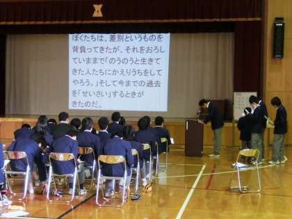 公開授業ということで、保護者の方や小学校の先生に参観いただきました。生徒たちだけでなく、我々教員も含め、改めて「人権」の大切さを考えることが出来た2時間でした。参観いただいた皆さん、有難うございました。