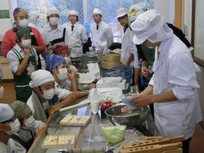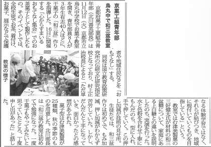 11月16日に実施した「心からすまいる〜おもてなし集会」の際のお茶会で来校者にふるまうお茶菓子作りの様子が、「菓業食品新聞」の11月22日号に掲載されました。この新聞は、菓子・食品・パン関連資材関係の専門誌で、業者の方だけが購読されている業界紙ですが、11月12日のお菓子作りの様子を丁寧に記事にしていただきました。これを励みに、これからも伝統文化教育を中心にした烏丸中学校の教育活動を進めていきたいと思います。