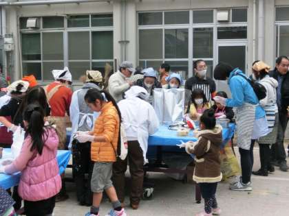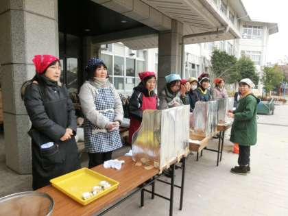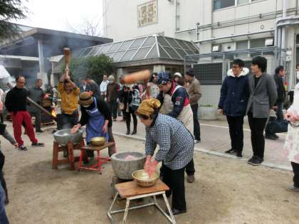あいにくの曇り空でしたが、朝早くから会場の室町小学校には、少年補導委員会の方を中心に、小学校と中学校のPTAの皆さんが集まり、餅つきの準備をしていただきました。午前10時になるといよいよ本格的に餅つきが始まります。次々と蒸しあがったもち米が、手際よくつかれていきます。白餅だけでなく、海老餅や豆餅と色とりどりにつきあがる餅を眺めていると、年越しが間近になったと思われます。次第に多くの住民・生徒・児童がグランド一杯に集まり、ぜんざい、きなこもちの列に並び、美味しそうに食べていました。立命館大学の「京炎そでふれ」の演技もあり、会場は曇り空を吹き飛ばす熱気にあふれていました。見ているだけではもったいないので、餅つきに慣れている教頭先生も参加して和やかにひと時を過ごしました。