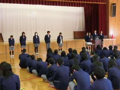生徒会執行部の司会の下、集会のスタートです。最初は校歌斉唱です。冬休み明けで、寒いこともあり、やや元気がなかったようですが、多くの人はしっかりと歌ってくれていました。校歌は烏丸中のシンボルです。もっともっと自信と誇りを持ち、堂々と歌ってください。次に生徒会執行部からの話です。今日から始まった3期の目標と、決意表明をそれぞれがしてくれました。全校生徒が一丸となって、もっともっと”からすまいる”溢れる学校にしましょう。