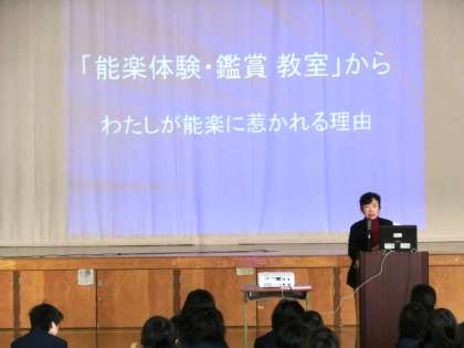 後藤先生からは、10月30日に実施した、河村能舞台での能楽体験鑑賞教室のまとめのお話をしていただきました。最初に、生徒の皆さんの感想文を読んでいただきました。体験した人、それを鑑賞していた人のそれぞれが、真っ直ぐなな気持ちで能楽に向き合っていた姿を感じることが出来ました。後藤先生も能楽にはまり、700年間続く伝統と、それを支える人々の思いが心を揺さぶられる・・・そんな思いを持たれたそうです。一生の内で、実際の生の能楽を鑑賞する機会はどれだけあるのでしょうか?3年生は3回目、これは人生の宝物ですね。来年も是非この取り組みを続けていきたいと思います。