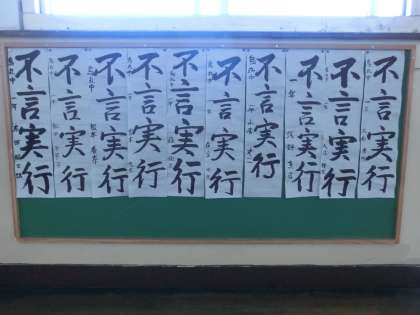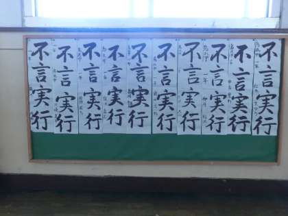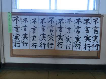 校内書き初め展(1年生の部)『不言実行』 公開日 2014/01/17 更新日 2014/01/17 学校の様子 3階の廊下は1年生の作品展です。中学生になって初めての書き初めの出来栄えはどうですか?『不言実行』どんな事もあれこれ言う前に実行して見せる、とても大切です。 全校生徒の作品の中から優秀な作品を選び、これから校外の作品展に出品する予定です。楽しみにしていてください。