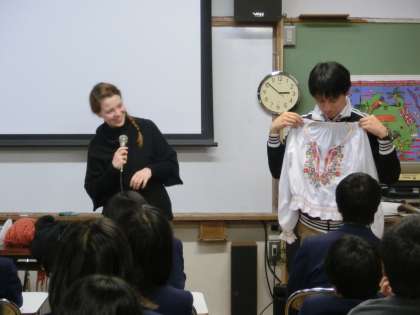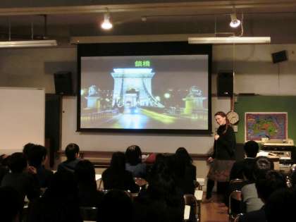 今日来ていただいたのは、サボー ジュジャンナさん、ハンガリーから京都大学に留学されている方です。視聴覚室で行われた学習では、ハンガリーの色々な情報を教えていただきました。ハンガリーの首都ブダペストは、”ブダ”と”ペスト”の2つの地域がドナウ川で別れていること、その2つの地域を結んでいる橋が美しいこと(鎖橋など)、地下鉄いに通じるエスカレーターがとても長い(2分以上)こと、温泉がいたるところにあり、プールのように広い湯船につかって、映画やコンサートなどのイベントが楽しめること・・・とても美しい写真と共に、ハンガリーの素晴らしさを伝えていただきました。面白かったのは言葉です。ハンガリー語はその語順が日本語と似ており、単語も日本語を思わせるものがあることに驚きました。プール=ウソダ、可愛い=ツキ、王様=キライ、赤ちゃん=ババ、デパート=アルハズなど、とっても意外でした。