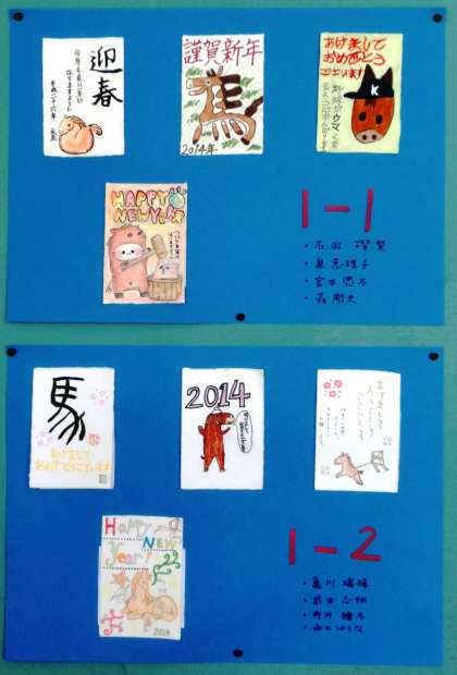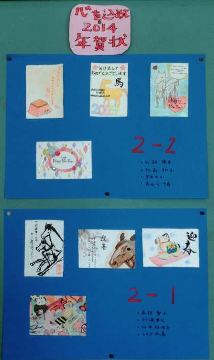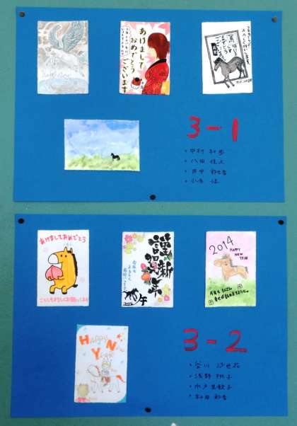 2014年 年賀状優秀作品! 公開日 2014/01/31 更新日 2014/01/31 学校の様子 冬休みの課題で提出された年賀状の中で、各学年の優秀作品を美術室に掲示しました。どの作品も、心が癒される素敵な作品です。授業で美術室へ行ったときに見てください。今年も良い年でありますように!