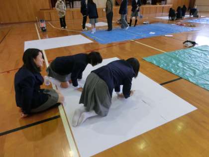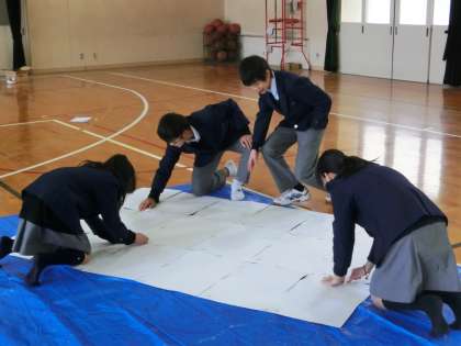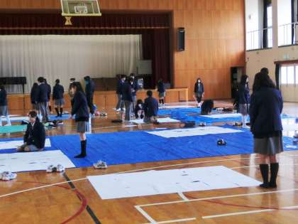 テストが終わった4時間目、体育館に2年生の代表30名が集合し、何かしています。何でしょうか?画用紙を貼り合わせ、ブルーシートの上に置き、鉛筆で何か下書きのような・・・これは3月12日の「3年生を送る会」へ向けての準備のようです。なかなか大がかりな取り組みのようです。3年生への感謝と思いを込めて、完成へ向けて頑張ってください!出来上がりが楽しみですね!