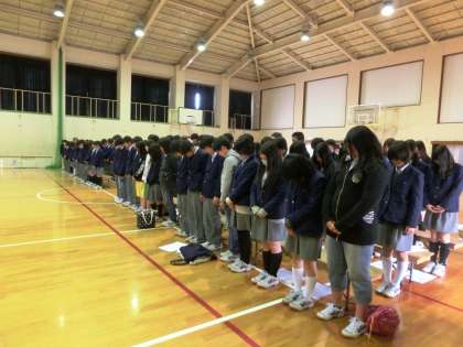 今日の6時間目、3年生を送る会のリハーサルの前に、体育館に集まった1・2年生と教職員全員で1分間の黙祷を捧げました。もう二度とこんな悲しくも辛いことを繰り返してはいけません。そのために、今自分がすべきことは何か、それぞれが考えてみてください。