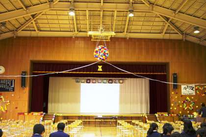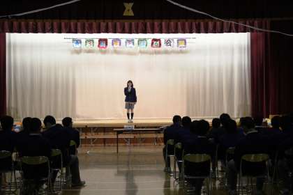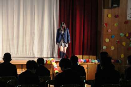 3年生を送る会〜オープニング 公開日 2014/03/12 更新日 2014/03/12 生徒会 今日12日(水)3・4時間目に、「3年生を送る会」が開催されました。まずはオープニングです。司会の開会宣言の後、3年生の入場です。一人ひとりの写真が映し出される中、3年生45名が舞台から登場しました。普通に登場する人もいれば、パフォーマンスをする人もおり、開会からちょっぴり心配?でも大丈夫、それが3年生です。 全員が着席した後、生徒会長の挨拶で送る会が始まりました。