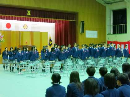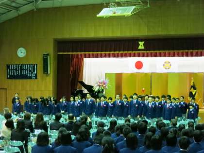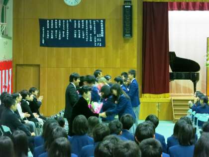 式歌「旅立ちの日に」と「蛍の光」斉唱で式が終了したあと、3年生からのお礼の歌です。「旅立ちの日に・・・」と題名は一緒ですが、河嶋あいさんの温かい歌です。歌いながら涙ぐんでいる生徒がたくさんいました。保護者、先生方へのお礼の言葉の後、お世話になった先生方へ花束を贈呈しました。「3年間有難うございました!」