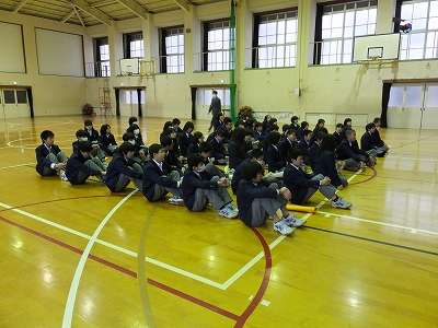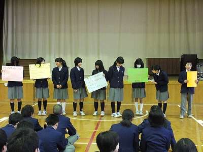 3月20日(木)体育館で1年生最後の学年集会が行われました。まず各クラスから生徒議員と班長が前に出て、それぞれのクラスの1年間の総括をしました。