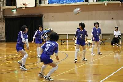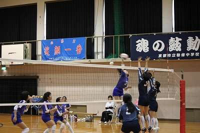 女子バレーボールは、岡崎中学校で、岡崎中学校と対戦しました。烏丸中学校は3年生がただ一人、あとは2年生が5人のレギュラーギリギリのチームです。