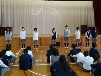 定例で、まずは全員で校歌を斉唱し、生徒会からの連絡やアピールがありました。校歌はまだまだ執行部も声が出ていないし、これからですね。生徒会からはあいさつ運動を中心に報告がありました。今年は全部の委員会が協力して運動を盛り上げようとしています。目と目を合わせてしっかりとあいさつしていこうと呼びかけがありました。