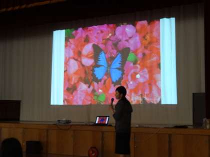 トップバッターは双見先生。きれいな昆虫のイラストを使ったある物語を通して、見かけではなくどうふるまうかが大切だという話がありました。「What really matter is How we behave」