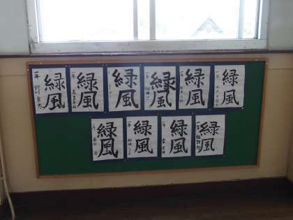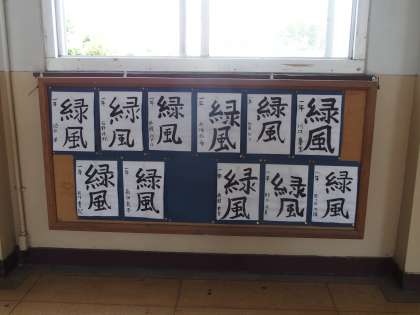 『緑風』吹き抜ける3階廊下〜1年生習字作品〜 公開日 2014/05/28 更新日 2014/05/28 学校の様子 3階廊下に1年生の習字作品が展示されています。作品は『緑風』と『大地』です。初夏の青葉を吹き抜ける『緑風』を感じさせる伸びやかな筆致です。「緑風」をめくると「大地」が現れます。