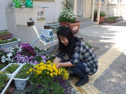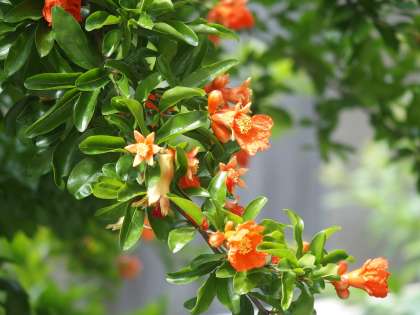 正門の両翼に朝顔(オーシャンブルー)の苗を植えていただいています。少しだけ蔓が伸び始めています。夏には鮮やかなオーシャンブルーの大輪を楽しむことができますように。いつも校内の花のお世話をしていただいている「田中和子さん」,ありがとうございます。本館南側の塀沿いのアジサイの間に,ザクロの木があります。たくさんの花が咲き始めています。秋には,たわわに実ったザクロの果実を楽しむことができるでしょうか。