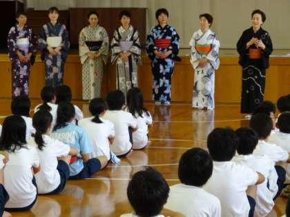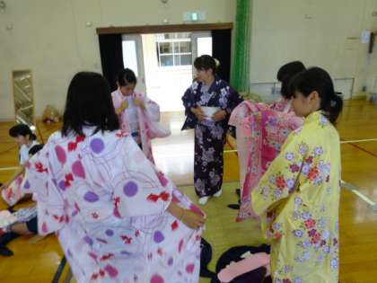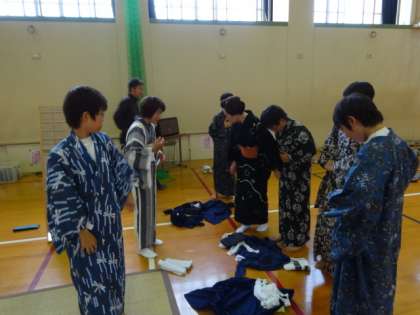 1年和装体験 公開日 2014/07/14 更新日 2014/07/14 学校の様子 家庭科の授業として「伝統文化」に関わる授業、「和装」の取組が、先週の金曜日に行われました。 今回は、「浴衣」の着付け体験でした。最近では浴衣は多くの人に親しまれ、まもなく始まる祇園祭に、浴衣姿で出かけていく人も多く見られるようになりました。授業では、浴衣の由来や、浴衣の作りなども教えて頂いたあと、それぞれ着ては脱いで、浴衣を自分で着られるように練習しました。