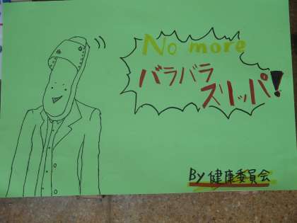 北校舎1階のトイレの入り口に「NO MORE バラバラスリッパ」のポスターが貼られています。健康委員会の作によるものです。そのキャラクターがとてもよく出来ており,面白いのでUPしておきます。映画館へ映画を見に行った時の,本編前に流れる「NO MORE 映画泥棒」のキャラクターを彷彿とさせます。次回作も期待します。