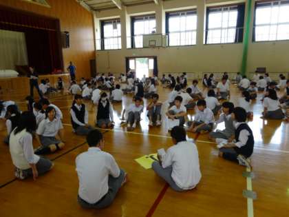 ワイワイガヤガヤと取り組みを終えた後は、仲良くなって体も心もほぐれたところで校歌を斉唱。いつもより格段に大きな声で歌うことが出来ました。中でも3年生のイニシアチブが目立ち、やはり3年生がやる気を出せば学校はもっと良くなる、そんな気持ちをつよくさせるものでした。