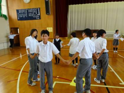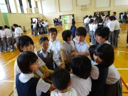 全校生徒をシャッフルした縦割りの12チームに分け、人間知恵の輪というゲームで競い合いました。1年から3年が、男子も女子も関係なく手をつなぎ、一体となって活動する姿は、烏丸中がみんな本校に仲が良く、ファミリーな雰囲気のある学校であることを感じさせるものでした。