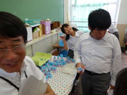 「健康・美化委員会」の部では、体力測定、石けん作り、健康ダンスの取り組みを参加型のブースとして行いました、。健康ダンスはまるでライブのように真っ暗な中、みんなが踊っていました。美化委員会はさらに消臭剤をつくり、健康委員会とコラボして発表を行いました。