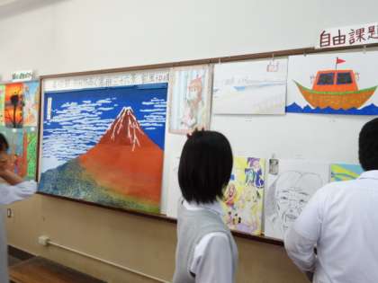 「美術」の部では、1年生の作品「愛着のある靴」、2年生作品「クロッキー」、3年生作品「自画像」が飾られ、みんなのセンスにただ驚くばかりでした。また美術部は、合同作品「葛飾北斎」にチャレンジし、立派な作品が掲示されていました。