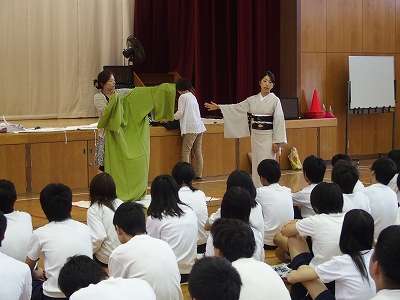 本日の5,6時間目、3年生は着物の着付け練習を行いました。