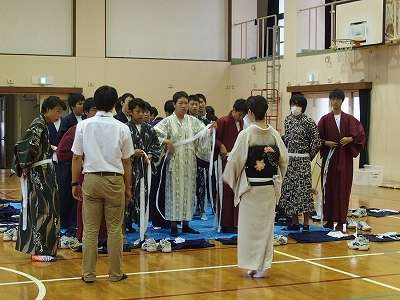 その日は、着物姿で一日を過ごし、着物姿で授業を受けます。その日のために、今日は着物の着付け練習をしました。保護者や地域の皆さまに着付けの指導のお手伝いをお願いしたところ、快く引き受けて頂いた保護者の方がおられ、お手伝いと言うより、文字通り師範として、ご指導頂きました。着かたからたたみ方まで一通り教わり、着ては脱いで練習しました。本番、一人で着られるといいのですが・・