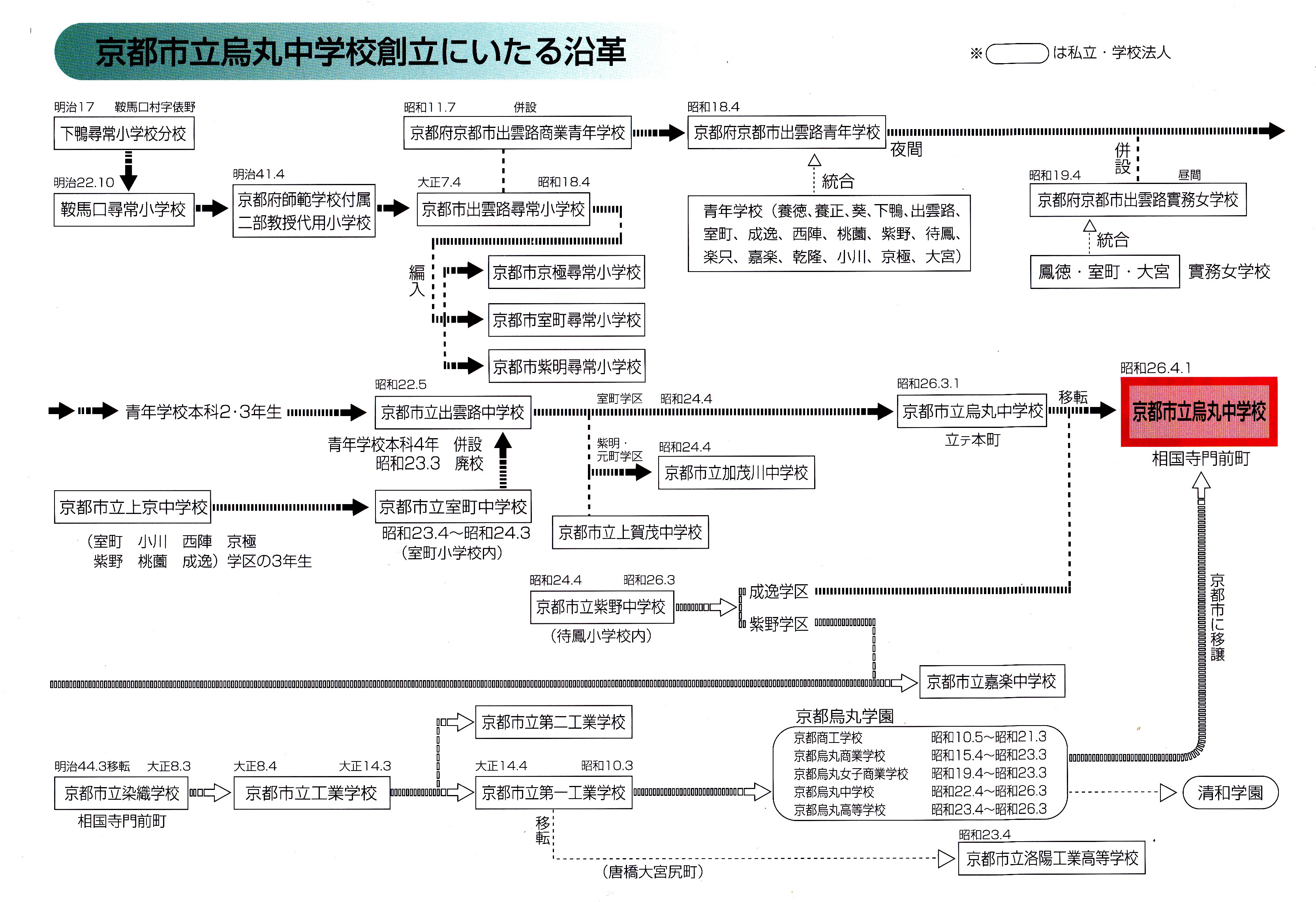 学校沿革史図 公開日 2014/10/14 更新日 2014/10/14 学校沿革史 沿革史が図式されたものが、50周年記念誌に掲載されていますので、照会します。 下記の文書をクリックして下さい。 烏丸中学校沿革史図