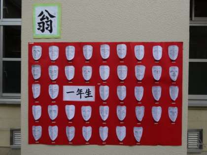 美術の授業はこの日はありませんでしたが、先日行われた河村能舞台の体験にからめて、能の「面」を題材にした授業が行われ、その時の作品が展示されていました。