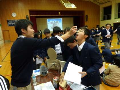 今日の5,6時間目を使って、PTA第6回の家庭地域教育学級と地生連と合同の取組として、体験型防煙教室が行われました。